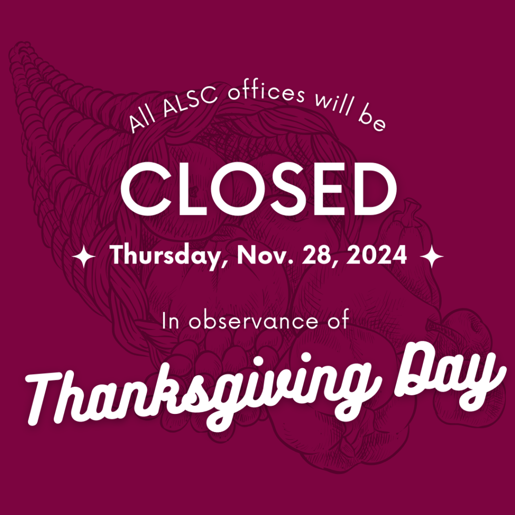 In observance of Thanksgiving Day, all ALSC offices will be closed on Thursday, November 28, 2024. Additionally, in observance of Native American Heritage Day on Friday, November 29, 2024, our offices will remain closed. Regular office hours will resume on Monday, December 2, 2024.